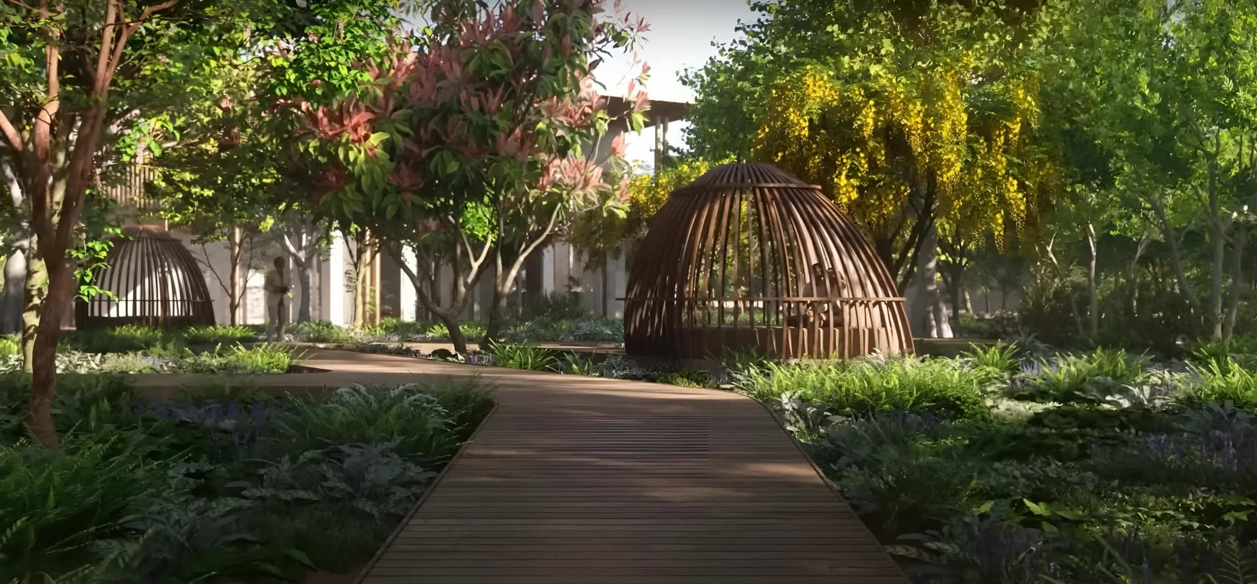 - 75% open green spaces with landscaped gardens, water features, and walking zones